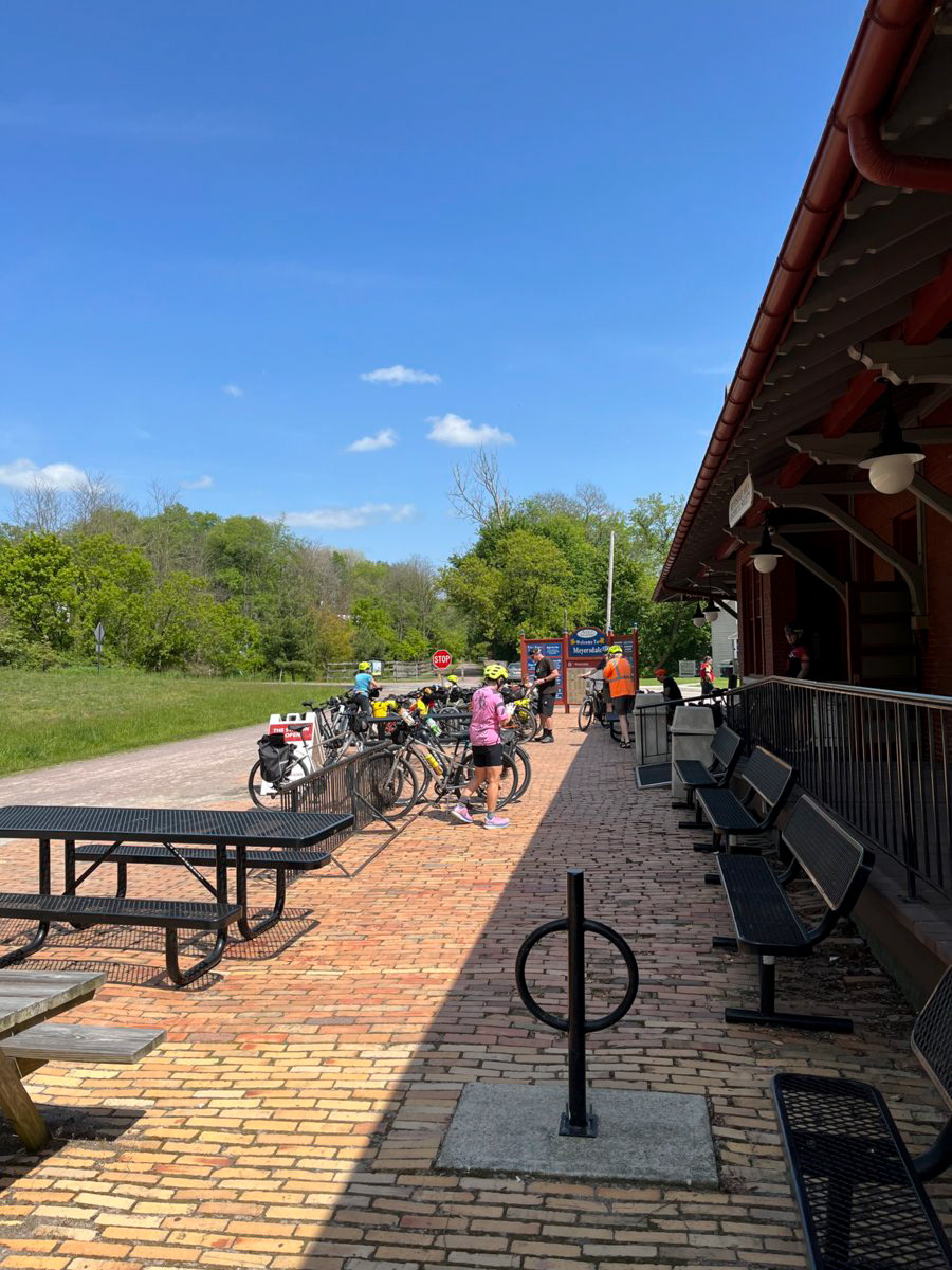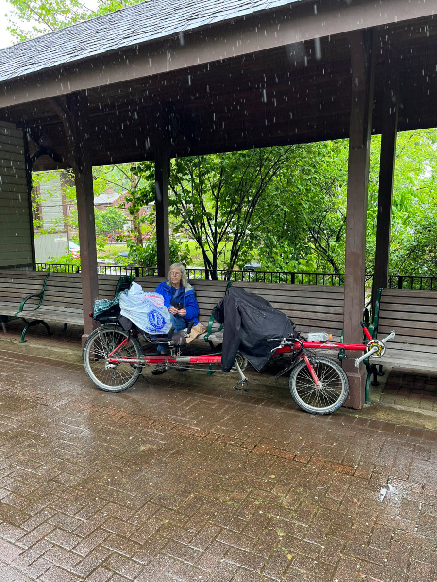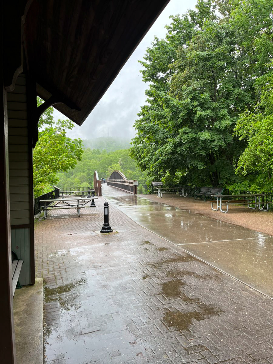 We sat here and watched the rain and chatted with other bikers for over an hour. This is in Ohiopyle, PA our furthest most point on the trail.